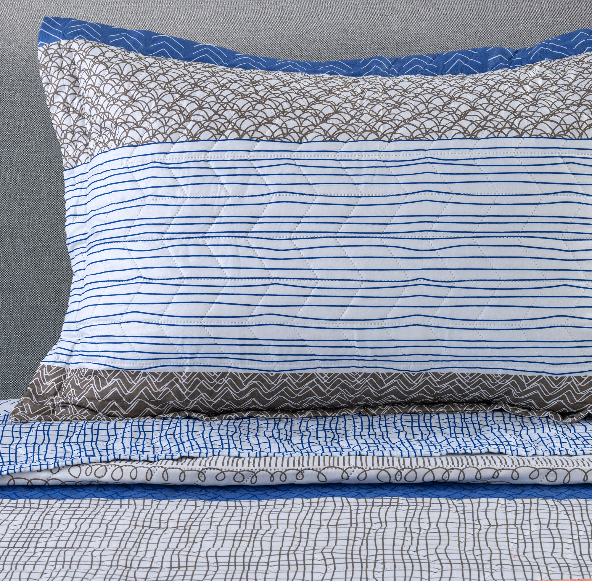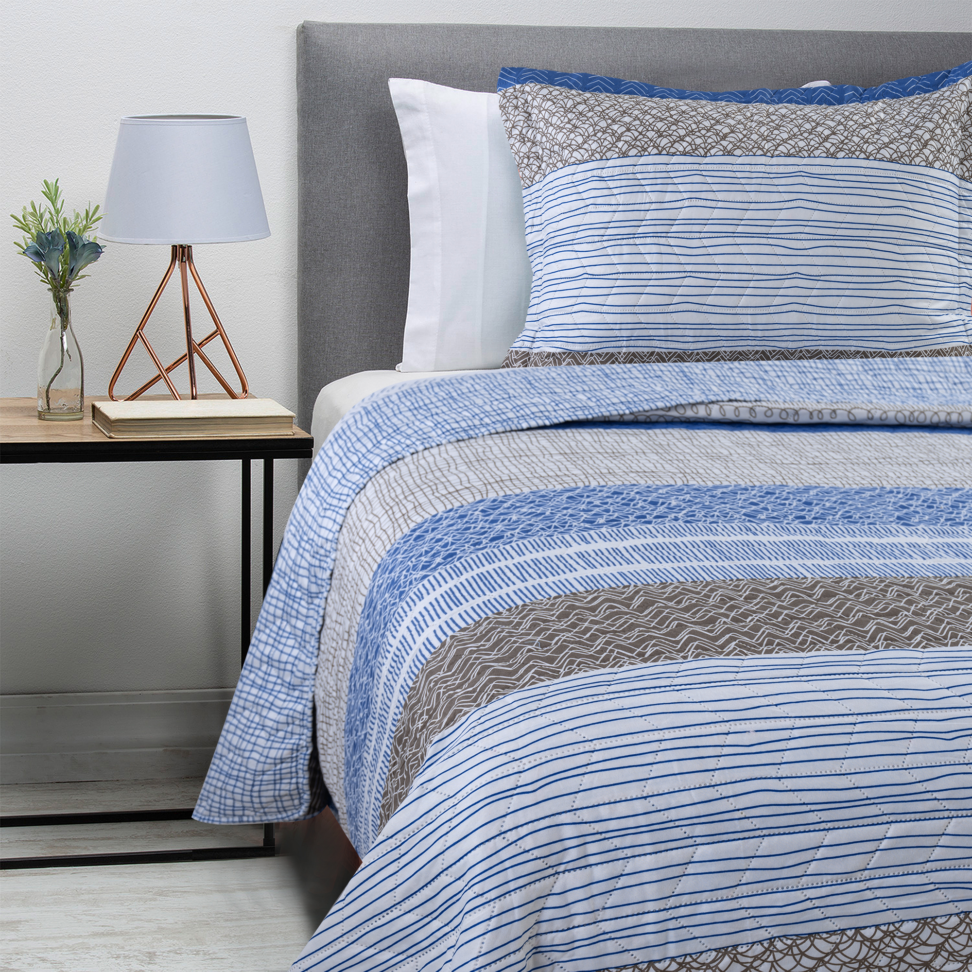 Cubrecama Ultrasonic Azul 1.5 Plazas, Este quilt combina estilo y funcionalidad, ofreciendo un look moderno para tu dormitorio. Ligero, proporciona suavidad y confort, Quilt estampado 100% Poliester, 70grs. Relleno, 100% Policoton 100gsm. 1.5P, 175x240cm + 1 Funda 50x70cm